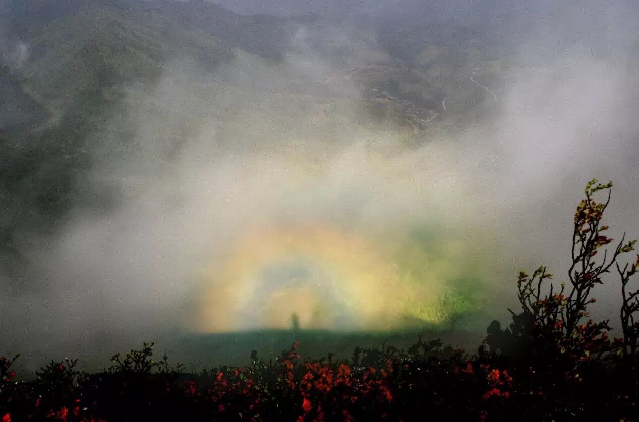 佛光:佛光是太阳光与云雾中的水滴经过衍射作用而产生的,一般出现在早晨和傍晚,中午太阳垂直照射,则没有佛光。佛光的出现必须要有阳光、地形和云雾等众多自然条件才能形成。因此,当遇到既有阳光又有云雾时,赶紧找个制高点,当太阳、人体与云雾处在一条倾斜的直线上,并且人在一个制高点上,“佛光”在西边的方向就会如约而至。