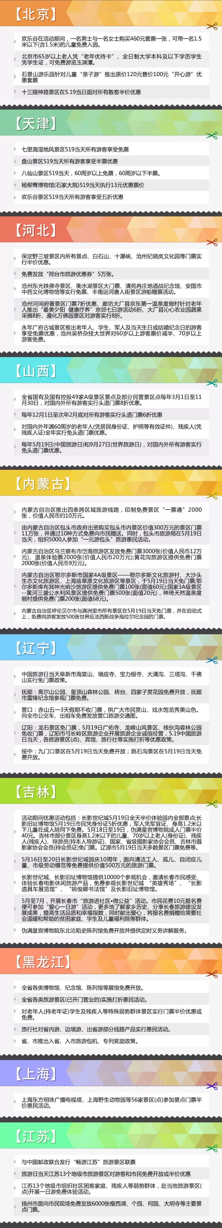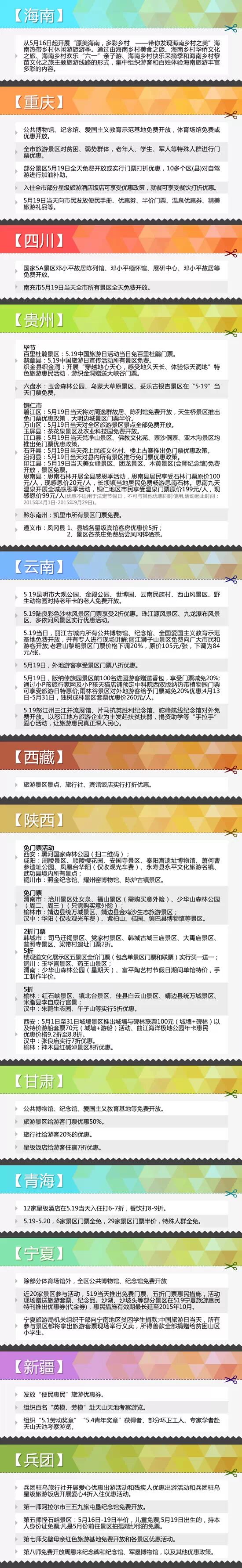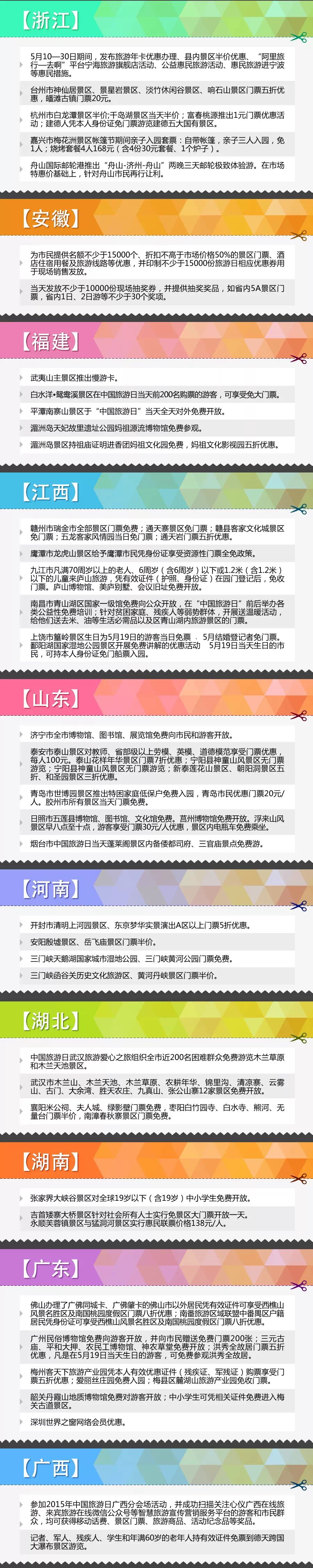 听说新加坡将从6月1日起给予符合条件的中国公民有效期长达10年的多次入境签证啦! 什么,你们还不符合条件?假期安排不开?离6月1日还早?新加坡太远?没关系,5.19“中国旅游日”越来越近啦~后天就是! 由国家旅游局主办的“中国旅游日”活动后天就正式开始了,其主会场活动将在湖北武汉启幕,同期,全国各地31个分会场也将举行一系列丰富多彩的活动。据了解,活动期间,全国的惠民措施多达3159项,而对于广大游客来说,最期待的莫过于这切切实实的折扣优惠。 “中国旅游日”第三优惠活动重磅来袭,今天海南、重庆、四川、贵州、云南、西藏、陕西、甘肃、青海、宁夏、新疆、兵团的小伙伴们有福啦~~ |